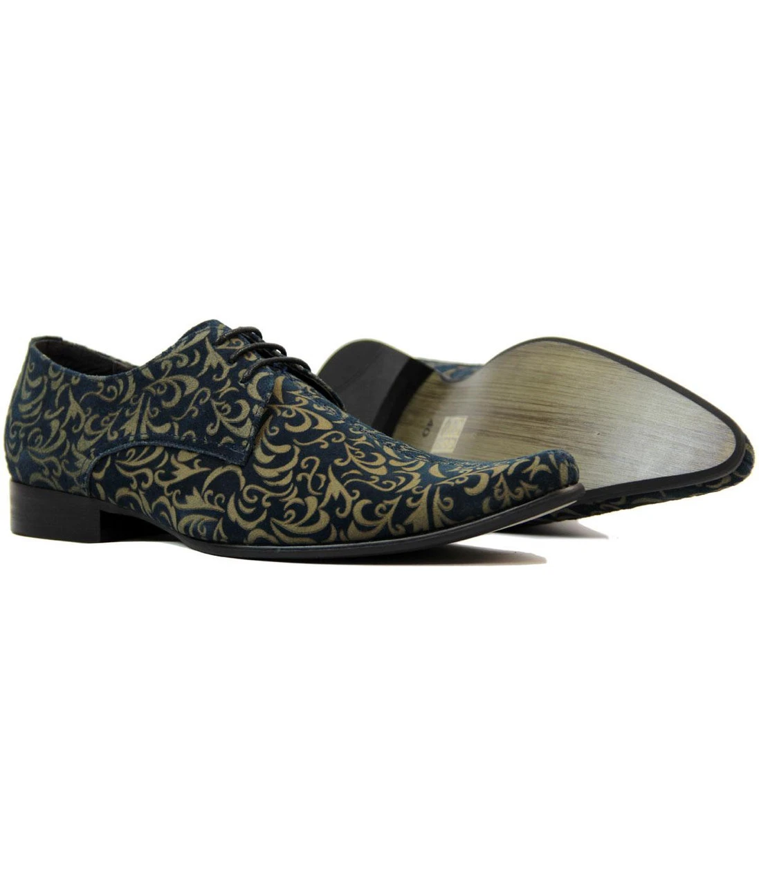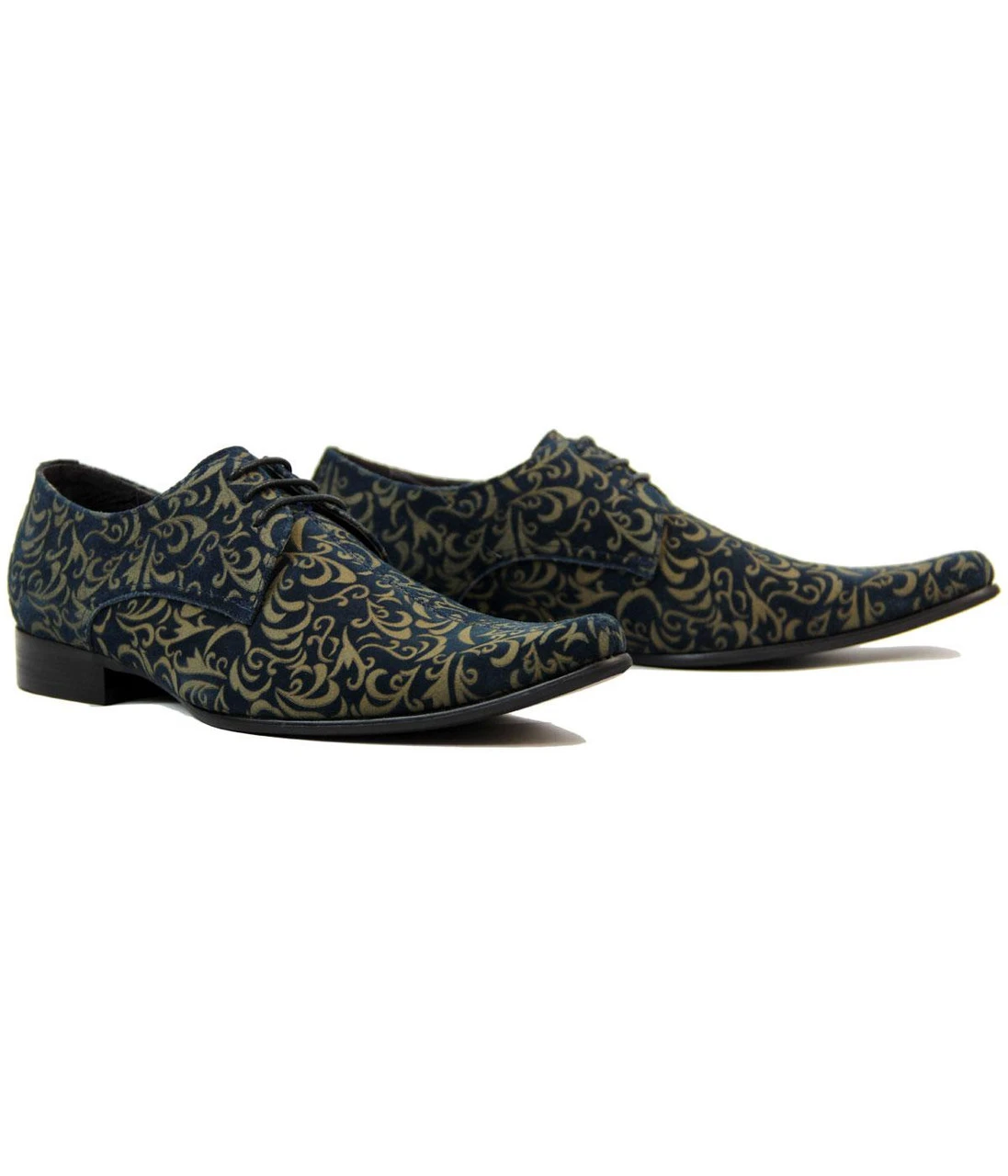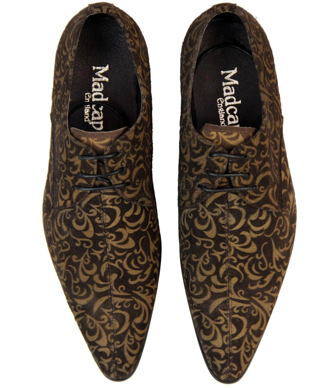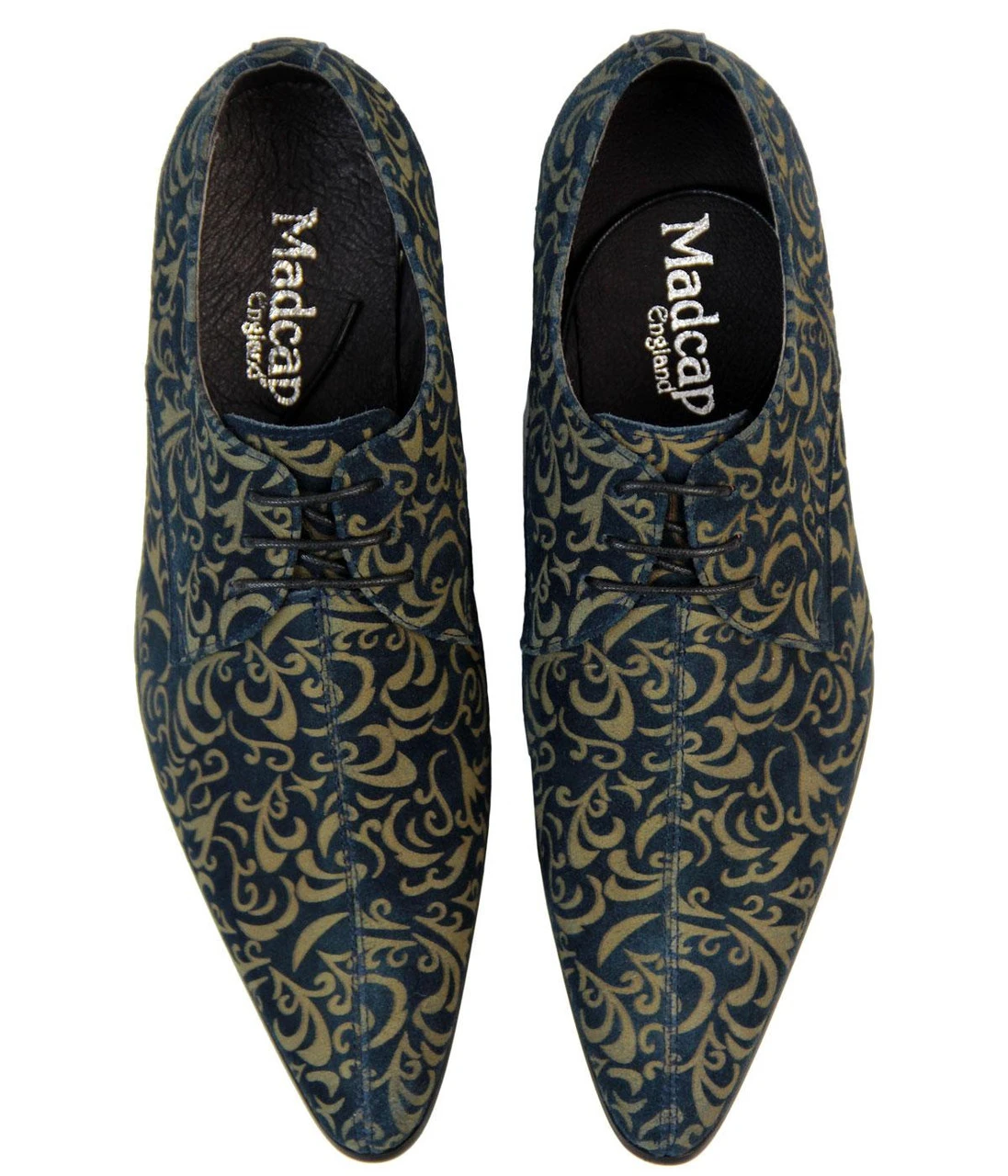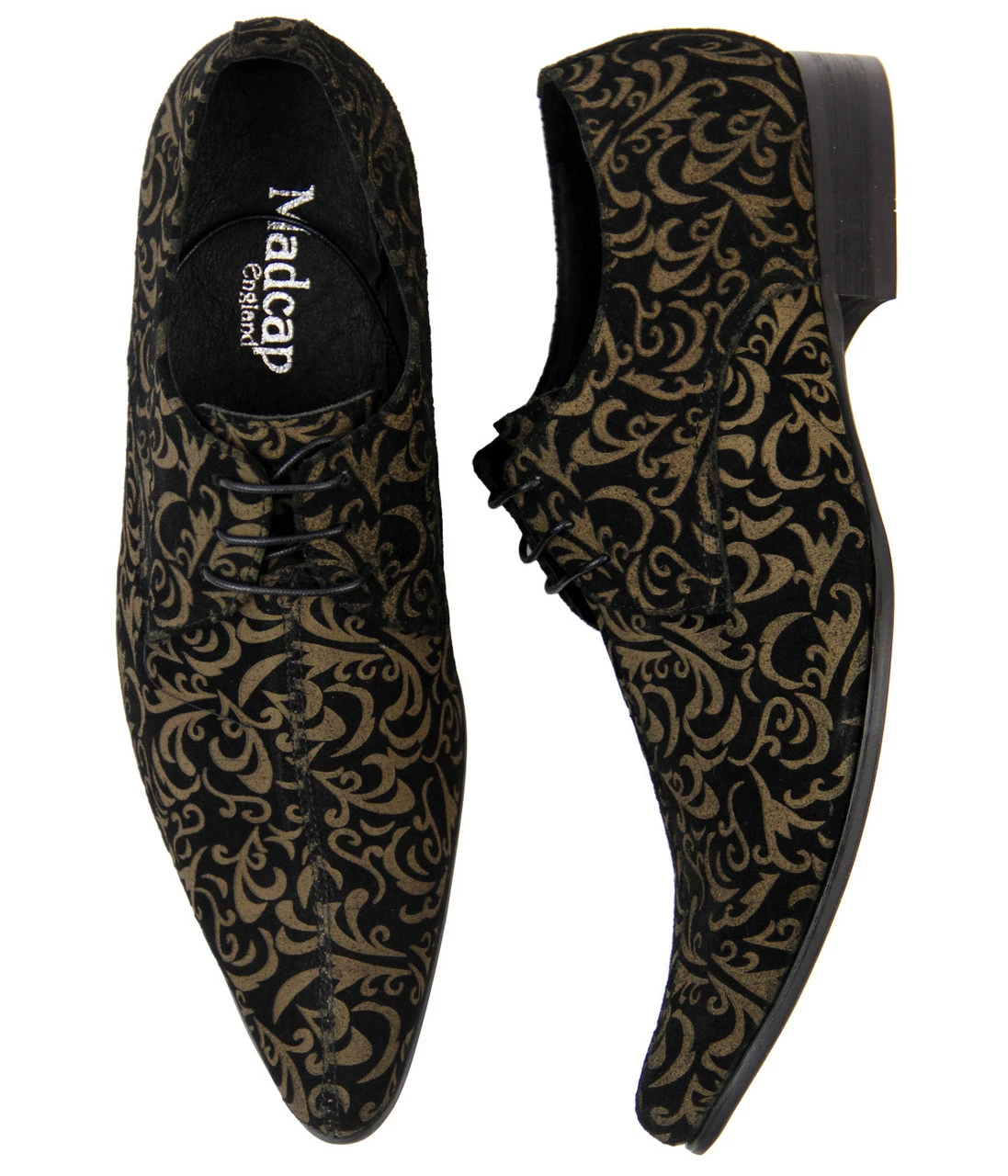 MADCAP ENGLAND ‘JAG’ MENS RETRO SIXTIES MOD PAISLEY SUEDE LASER CUT WINKLEPICKERS – Black Paisley Mod Mens Suede Winklepicker shoes with fab laser cut Retro Sixties Paisley pattern. Classic Winklepicker pointed toe, block heel. Self coloured laces. Superb laser engraved Retro Floral Paisley detail throughout. ‘Jag’ Mens Winklepicker Shoes by Madcap England.